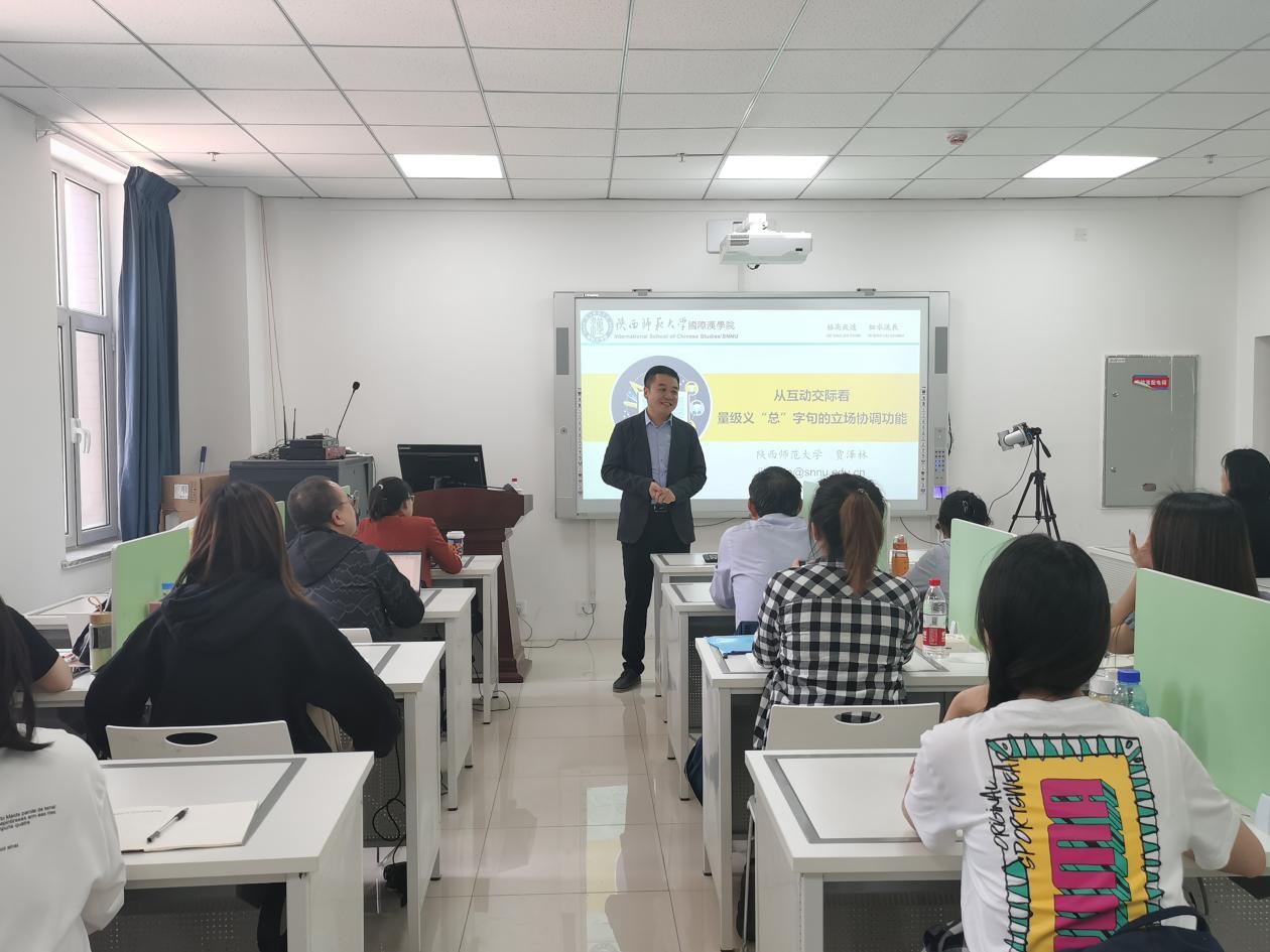 5月24日,应学院邀请,在文科实训楼404教室,贾泽林副教授来院做了题为《“从互动交际看量级义“总”字句的立场协调功能》的学术讲座。讲座由王晶老师主持,学院师生40余人参加。