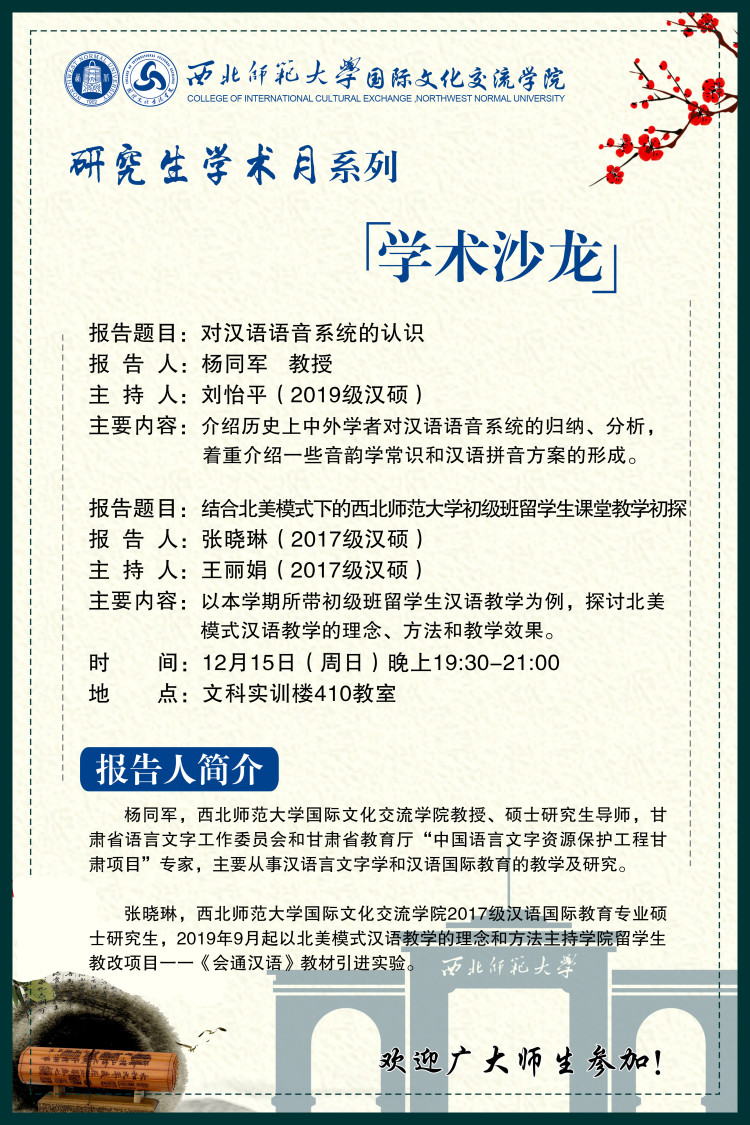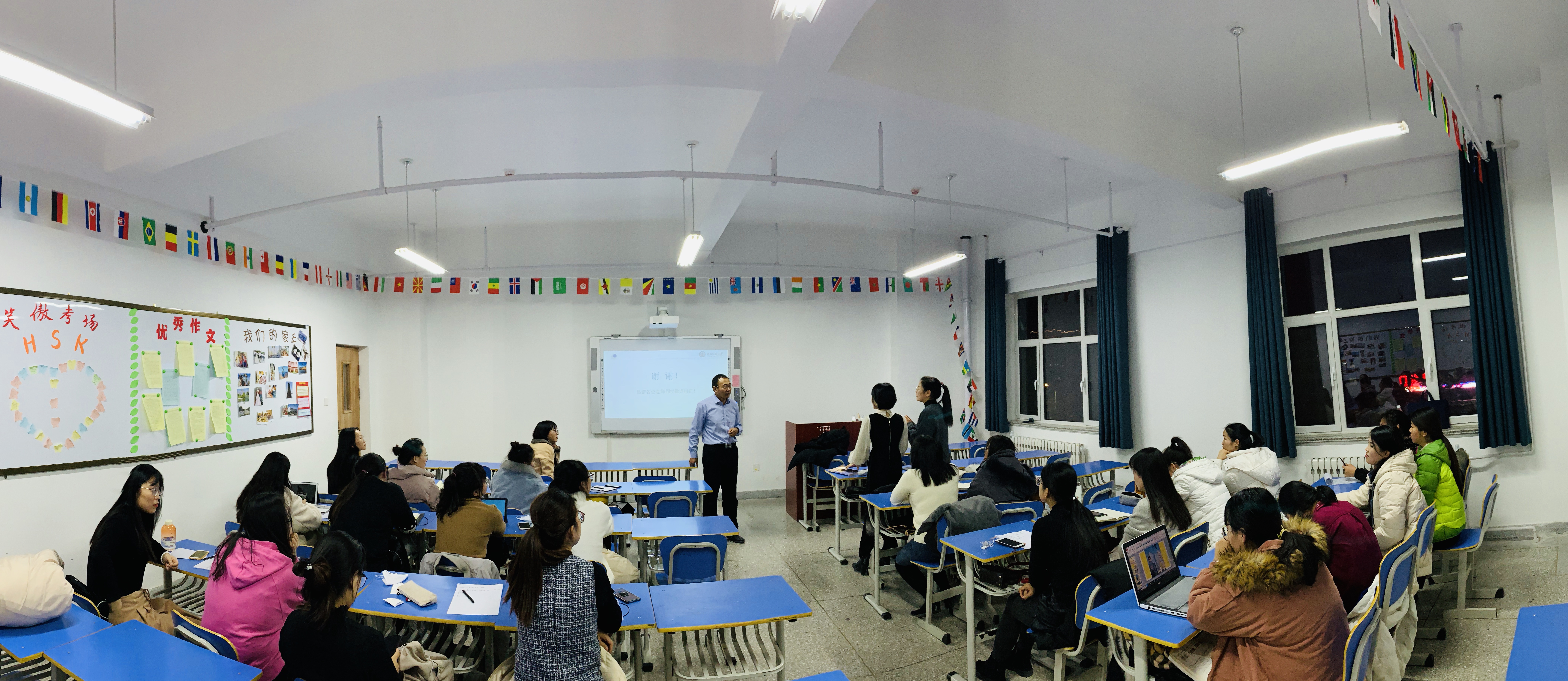 2019年12月15日(周日)晚19:00-21:30“研究生学术月”系列讲座在文科实训楼410教室举行。金年会手机登录国际文化交流学院硕士生导师杨同军教授做了题为《对汉语语音系统的认识》的精彩讲座,杨同军导师组17级汉硕研究生张晓琳同学做了题为《结合北美模式下的金年会手机登录初级班留学生课堂教学初探》的学术报告。