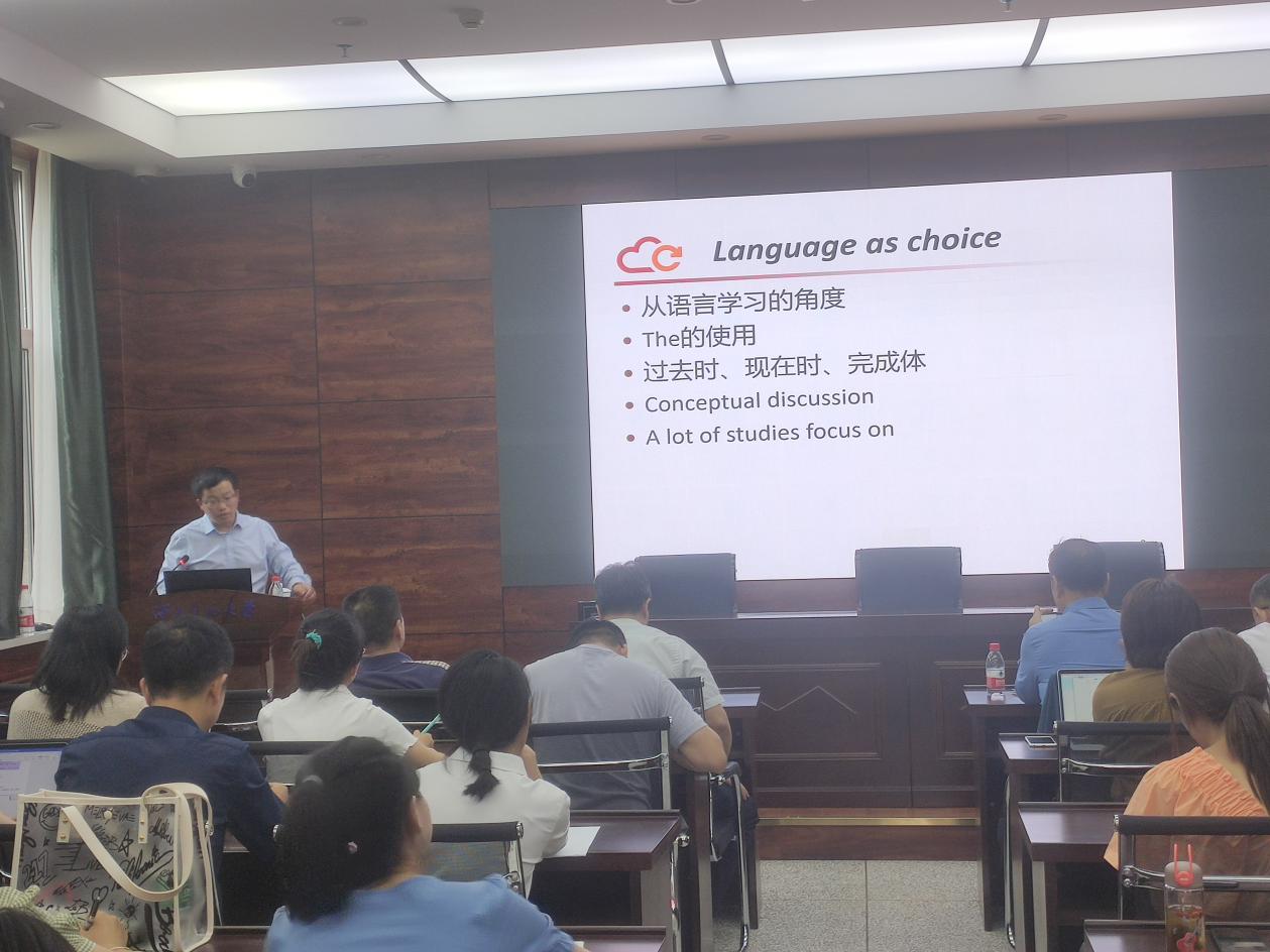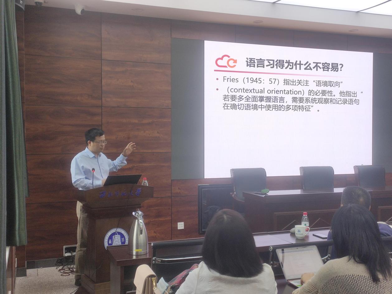 6月24日,应学院邀请,北京外国语大学教授、博士生导师许家金在文科实训楼102会议室作了题为《概率语境共选视角下的汉语中介语习得及教学研究》的学术讲座。讲座由武和平教授主持,学院师生60余人聆听讲座。