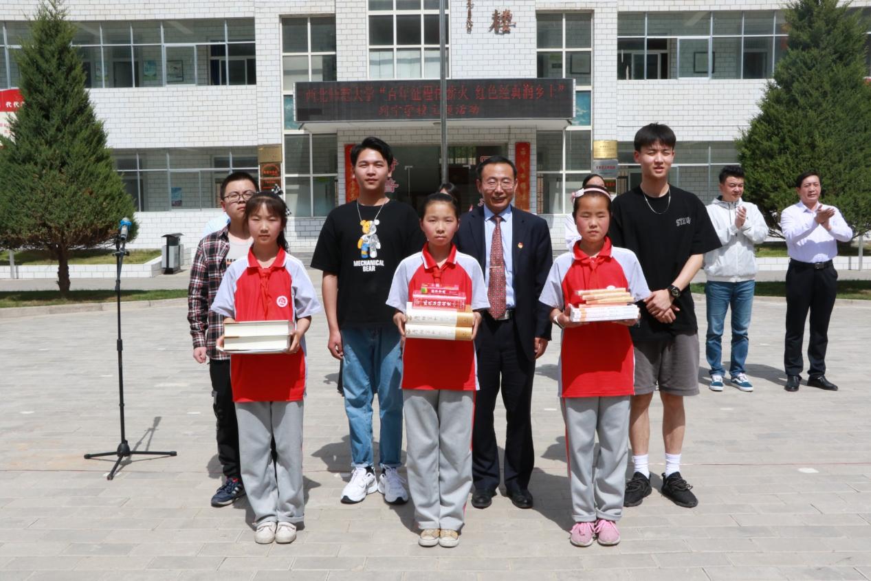 列宁小学是习仲勋等陕甘边革命根据地领导人紧密结合南梁苏区的实际,依靠工农群众的力量,在艰苦卓绝的斗争中创办和发展起来的红色学校。在列宁小学,我院党员为师生捐赠了《厚德家训》等图书、开展普通话培训、演唱与指导排练红色经典歌曲。随后,双方就“南梁精神”“国家通用语言文字推广”等话题进行了深度座谈,党员教师杨同军教授着重指出创新艺术传播多样性的重要性,建议将书本上和记忆里的红色故事用更加新颖的方式传播和继承。
