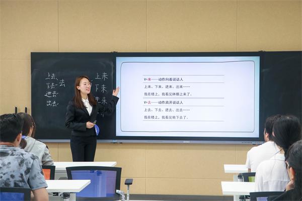 决赛现场,张亦潇讲解《发展汉语I》课文“妈妈给我寄来了礼物”中的语法点:简单趋向短语“来”和“去”,她播放生动有趣的动画视频帮助学生代入情境,并使用玩偶教具演示“来”和“去”表示动作的不同方向。来自巴基斯坦的留学生同学积极参与互动,踊跃回答问题,展现了积极活泼的课堂氛围。最终,张亦潇获第二名,并被推荐参加全省总决赛。