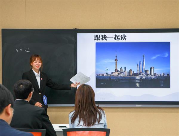 权杰通过说课和试讲两个部分讲解了《发展汉语I》课文“我当过英语老师”中“V+过”的语法点,运用大量的图片和视频带领现场留学生思考和互动,达到了精讲多练以学生为中心的教学原则,组织留学生进行造句对话练习,留学生最终掌握该语法意义及用法,实现了顺利交际的目的。最终,权杰获第七名。