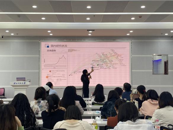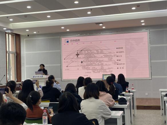 讲座中,尹春梅从研究综述,研究现状,研究内容,影响因素及对策等方面展开讲解,提出自己的观点。在研究综述部分的讲解中,尹春梅指出:本研究的意义在于助力中国与“一带一路”沿线中亚各国互通互联,克服碎片化研究的不足等。她用一个个案例对中亚国民教育体系、孔子学院、培训机构以及中小学母语教学的现状进行详细阐述,并从国家需求、民众需求以及双方支持层面对汉语传播影响因素进行分析。最后,她对汉语传播的应对措施一一展开解释,尤其以吉尔吉斯斯坦和塔吉克斯坦两国情况为例进行较为详细的说明。尹春梅在讲授之余,也向在座师生分享了其在调研过程中的所见所闻。同时也对在场师生提出的问题或困惑一一做了详细且全面的解答。