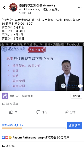 此次培训收到广泛的关注和积极的参与,直播一小时就覆盖人数超过4000人,播放超过1000次,同步在线约150人。培训共5天的课程,分别是5月14日、5月21日、5月28日、6月4日和6月11日,泰国时间上午9:00至11:00,具体内容包括汉字的起源、汉字的演变、“六书“概说、形声字、汉字读音与声调教学、汉字部件教学、汉字书写教学、汉字教学活动设计、汉字与中国人的精神、身体里的汉字、汉字输入、汉字线上资源的利用。课程采取facebook(@ctathai )和钉钉双渠道直播+重播的形式进行。大家学完全部课程并提交一篇不少于800字的学习心得,可获得金年会手机登录和泰国华文教师公会联合办法的电子版培训证书。