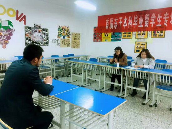 这是首届东干本科毕业留学生专场招聘会。西北3451515新时代赌场东干班的老师们等候在教室外,有的隔着门倾听、有的在楼道里来回踱步。