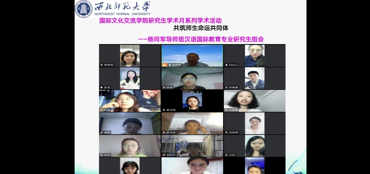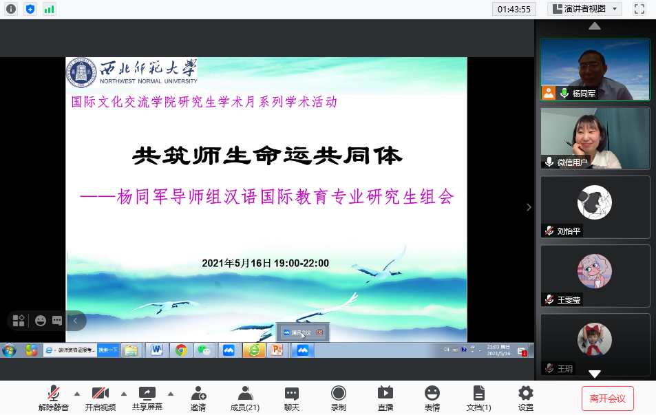 2021516日星期日晚上2000——2200,杨同军导师组在腾讯会议召开了全体会议,本次组会的主题为:同成长、互交流,共建师生命运共同体。特邀成员有15届汉硕毕业生陈艺文(现就职于安宁区阳光小学);14届汉硕毕业生李艳婷(现就职于白银税务局)。
