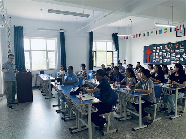 为深入落实《教育部关于一流本科课程建设的实施意见》以及学校《一流本科课程建设实施方案》,扎实推进学院一流专业建设和“金课”建设。国际文化交流学院依托四支特色教学科研团队,经过前期深度酝酿,于7月21日上午9:00-11:00、下午15:00-17:00在文科实训大楼410教室召开一流本科课程建设推进会。特邀学校教务处潘竟虎副处长做专题辅导,武和平院长主持会议,全院教师参会。
