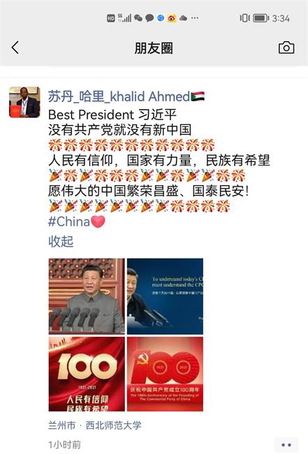 在校来华留学生们也自发通过不同方式观看、了解庆祝中国共产党成立100周年大会盛况并纷纷点赞。苏丹籍留学生哈里在看完直播盛况后,在微信朋友圈分享了他的喜悦心情,祝福伟大的中国繁荣昌盛、国泰民安。